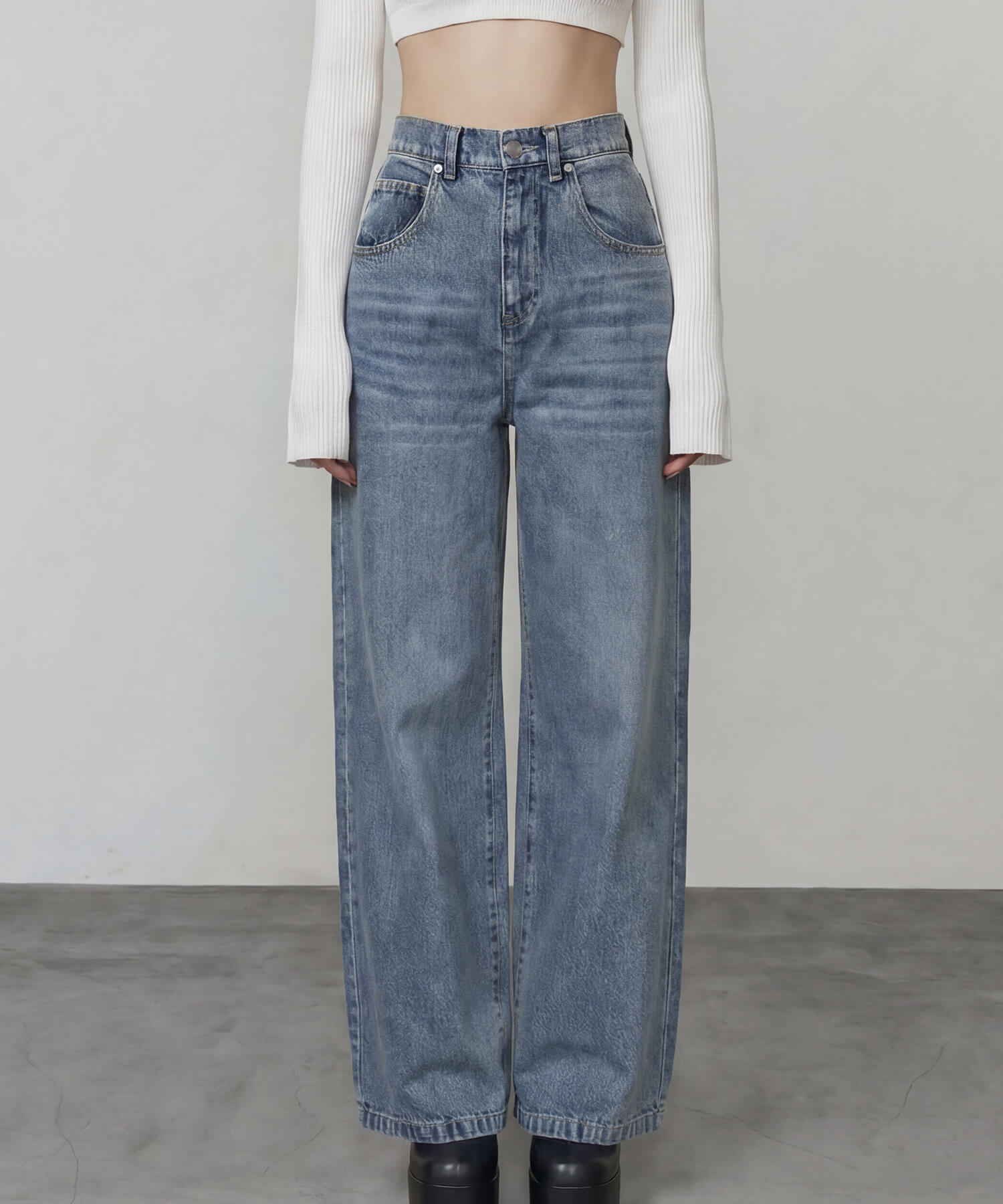 太すぎないミディアムワイドなストレートシルエットで使い勝手良く、一見ベーシックな定番デニムながら、後ろ姿に一癖ありなデザインがポイントです◎
