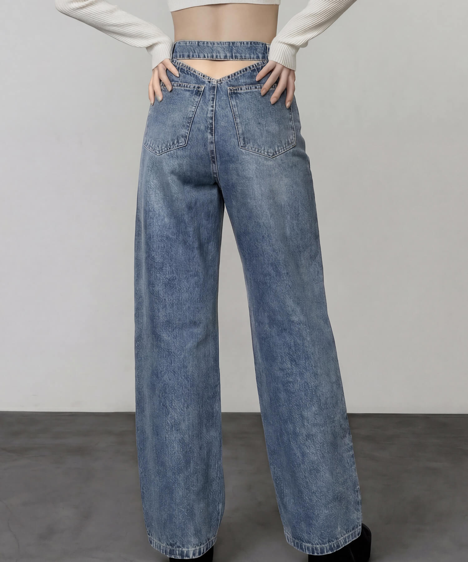 バックの逆三角型カットアウトが特徴的なデニムパンツ。