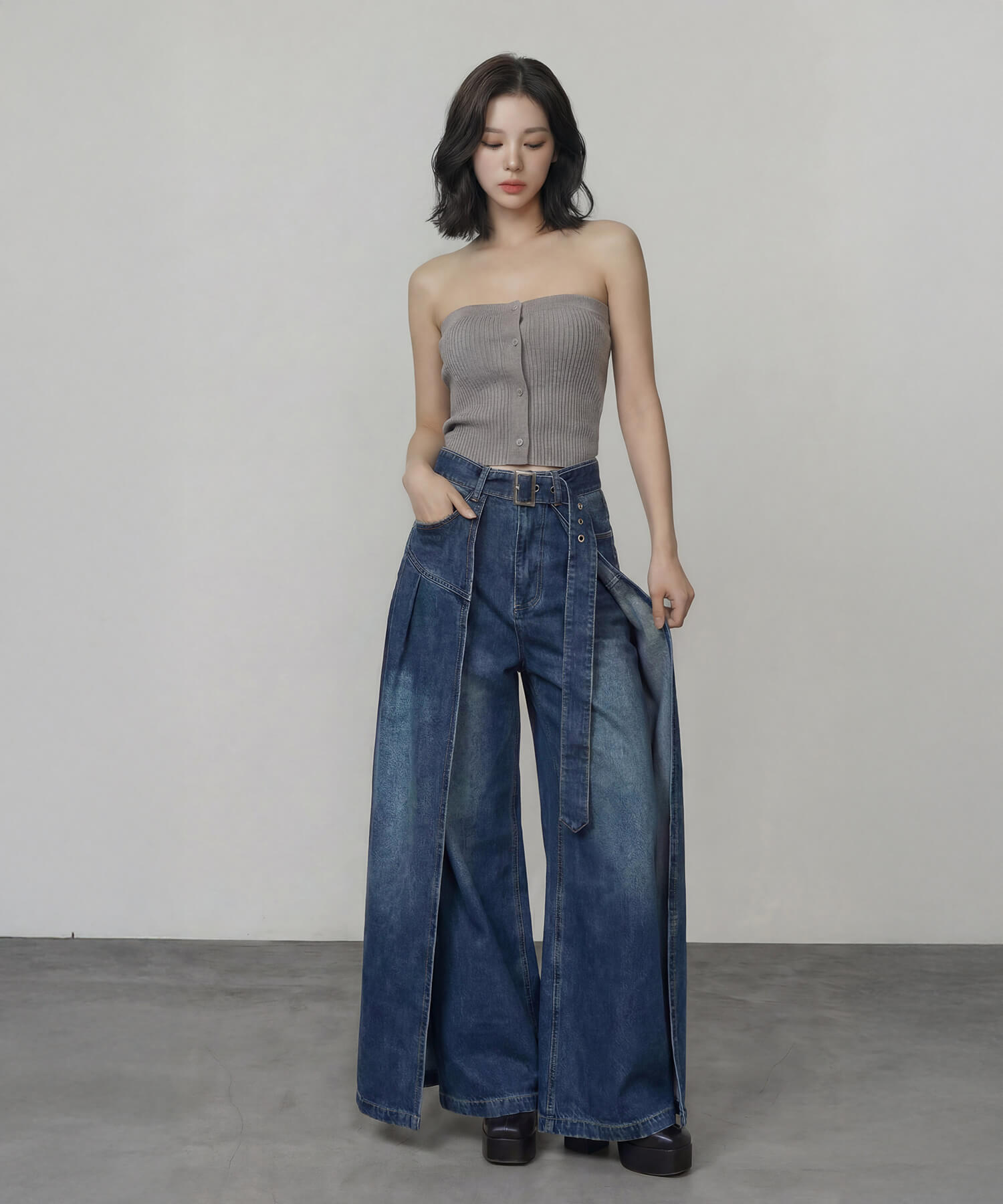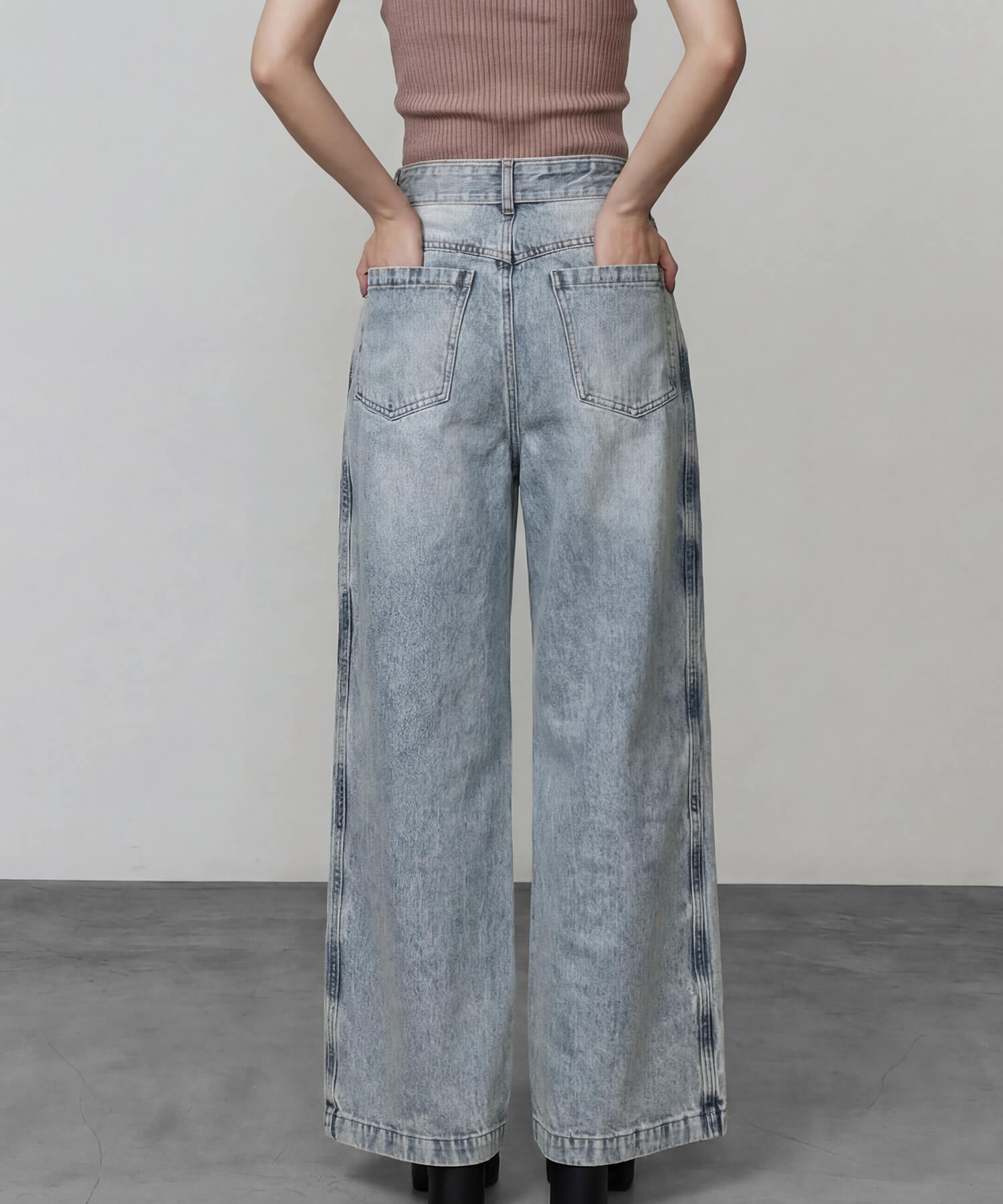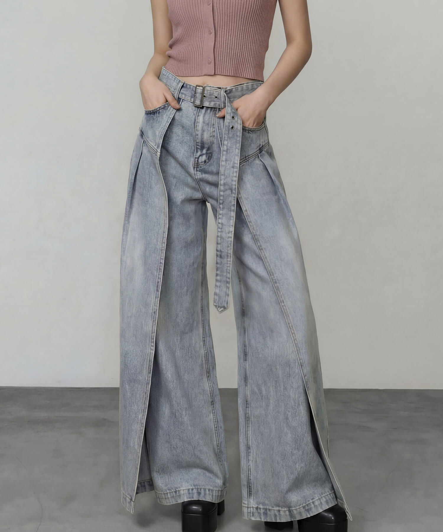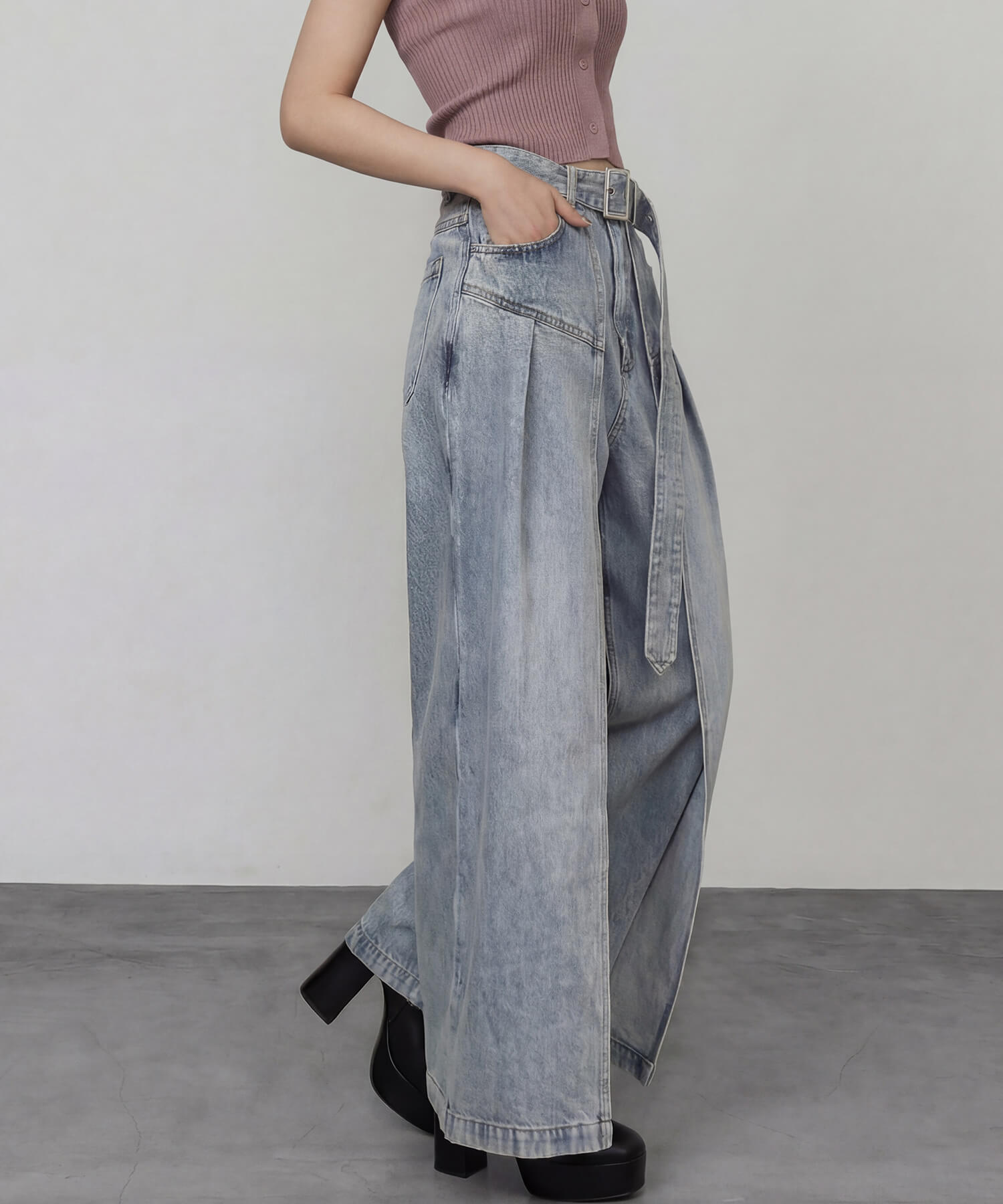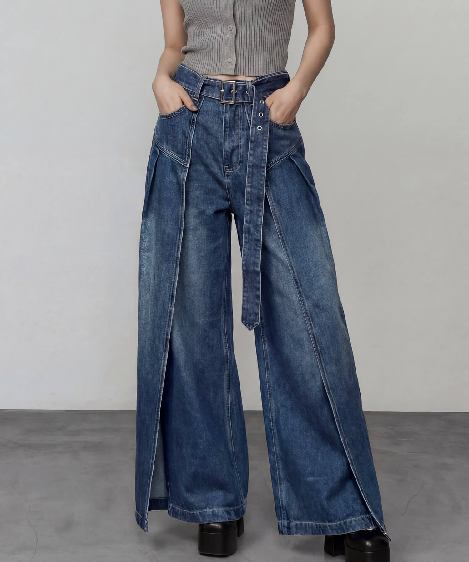 サイドパネルの生地を重ねたデザインが特徴的な、着脱可能な共地ベルト付きのワイドデニムパンツ。