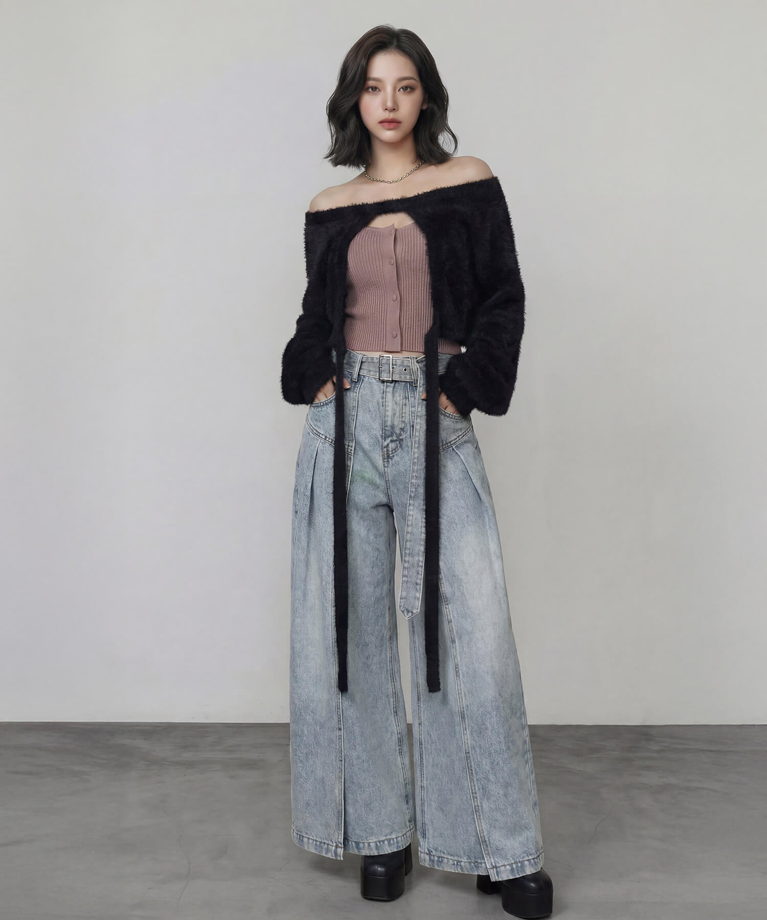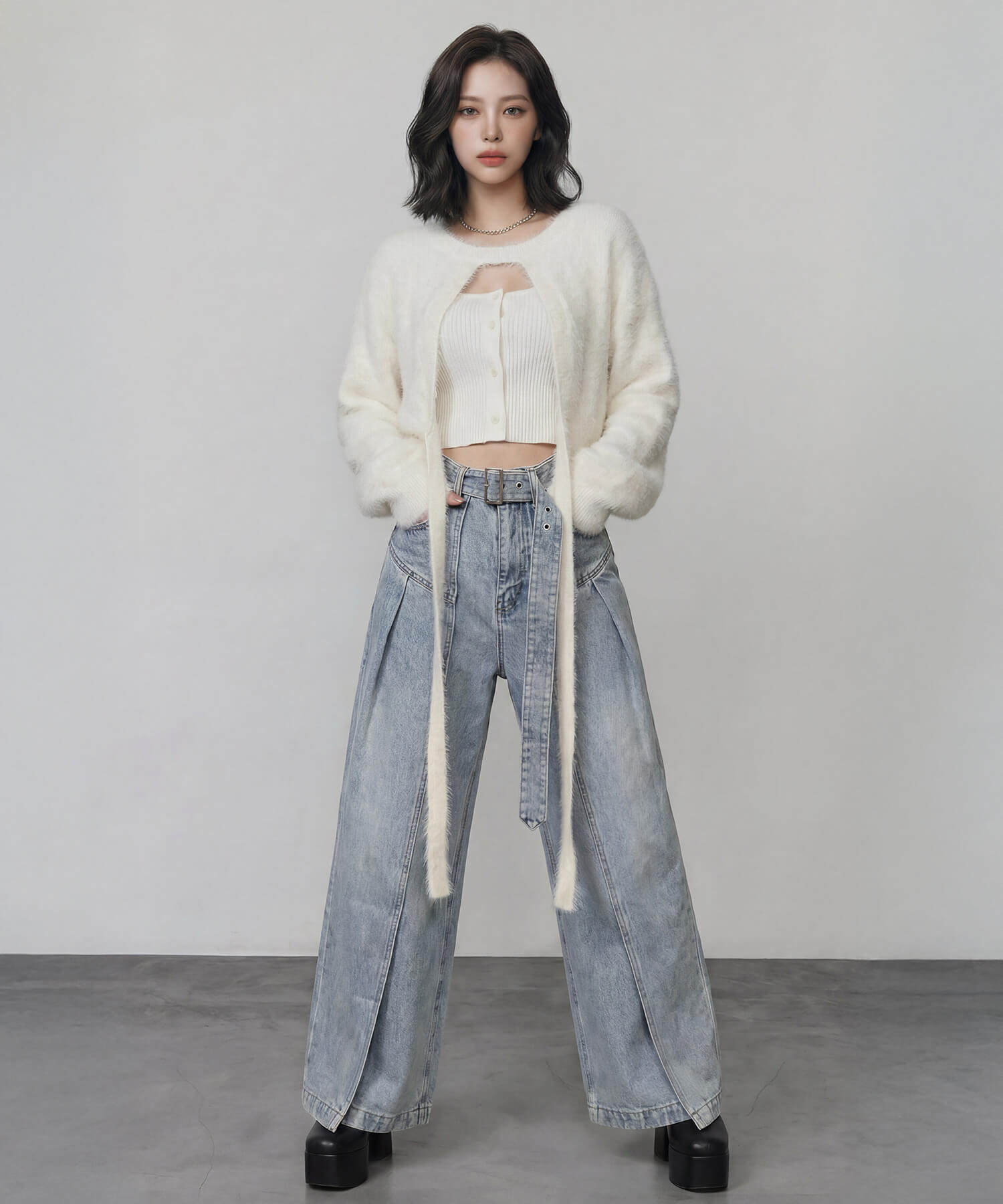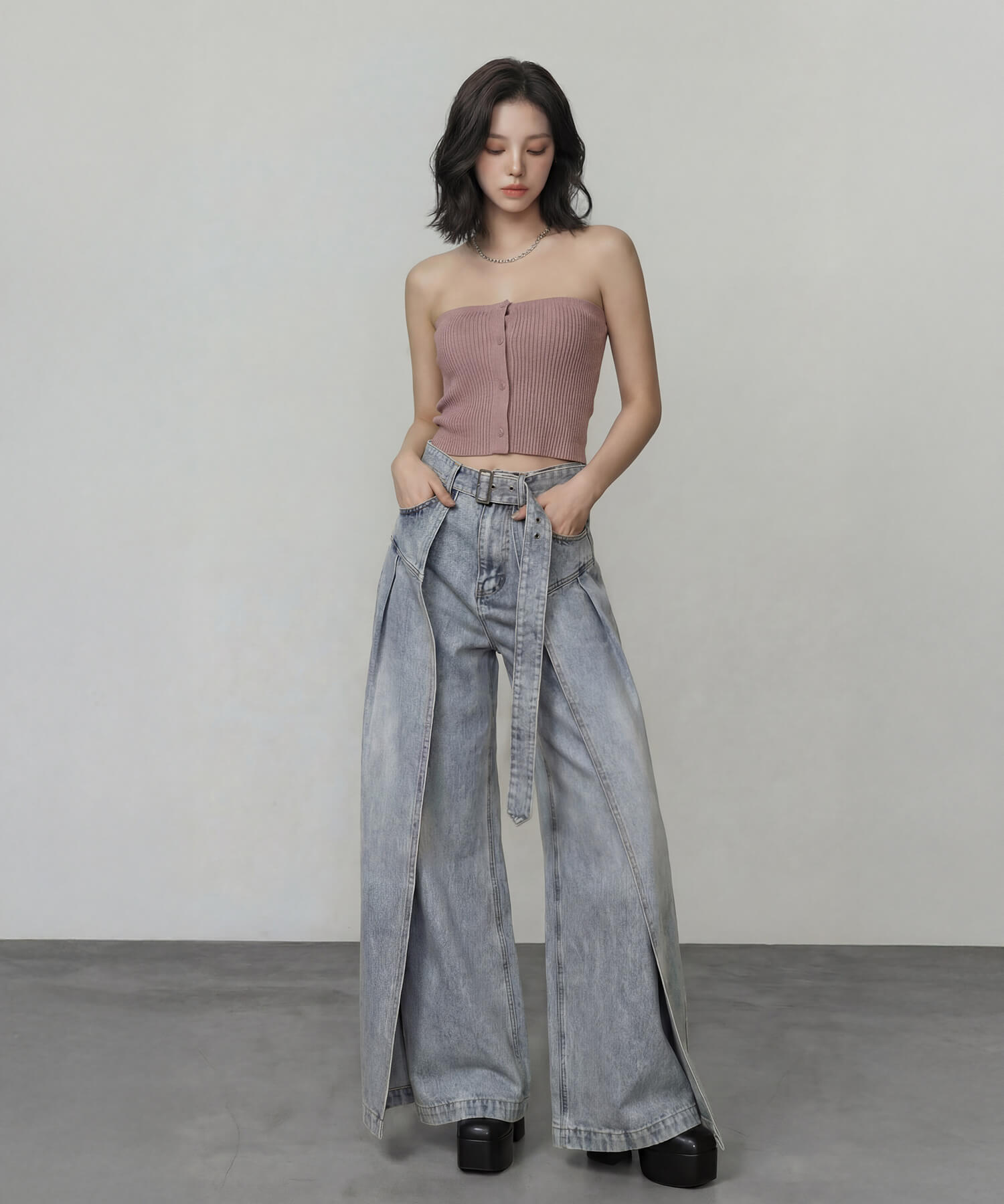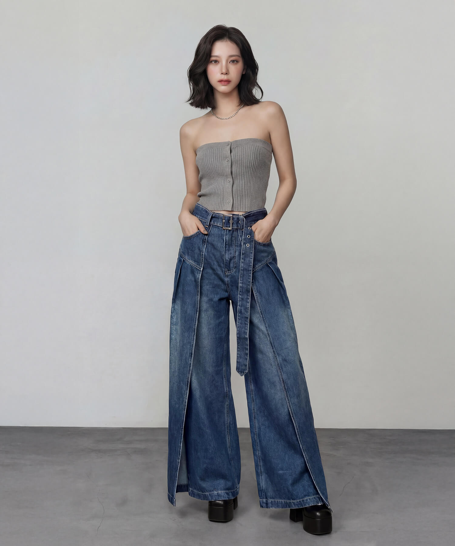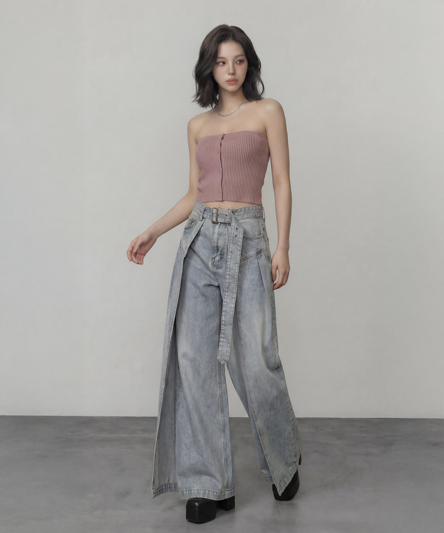 サイドパネルの生地を重ねたデザインが特徴的な、着脱可能な共地ベルト付きのワイドデニムパンツ。