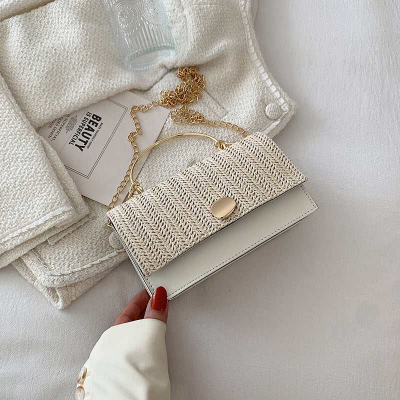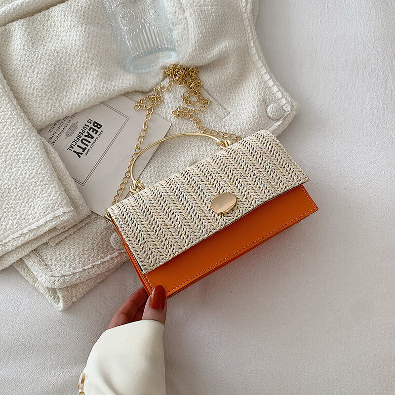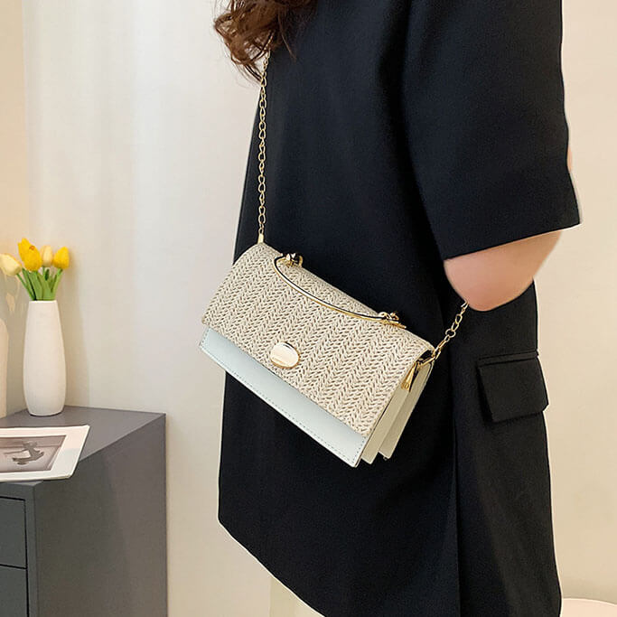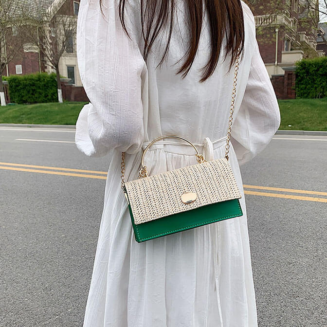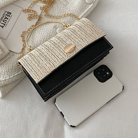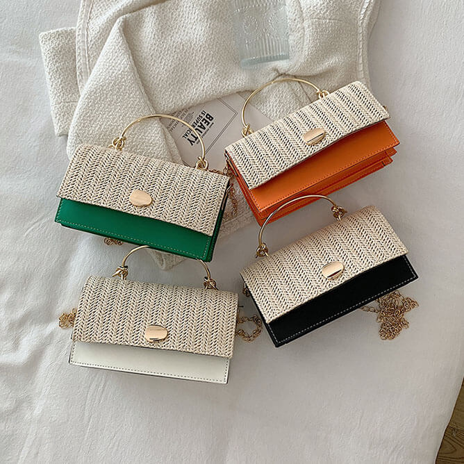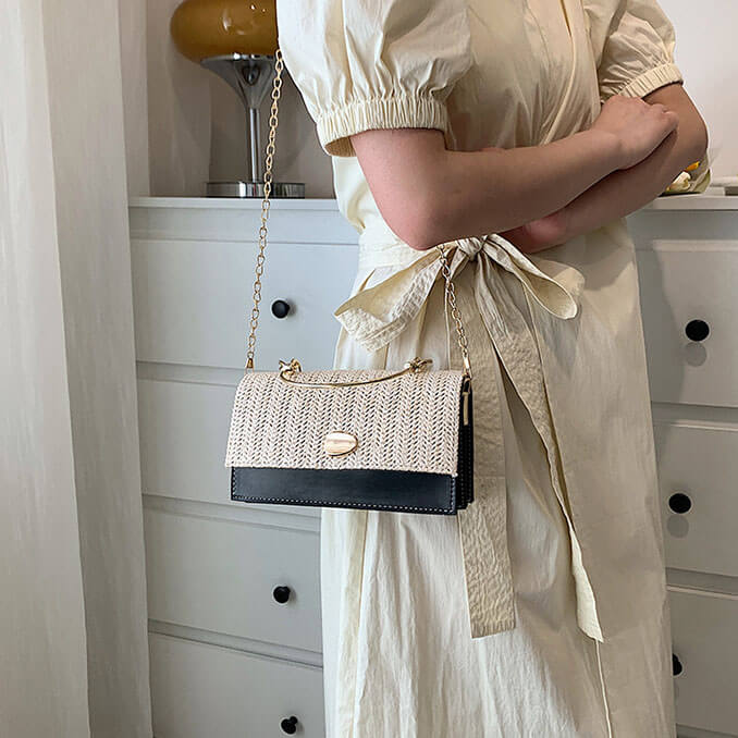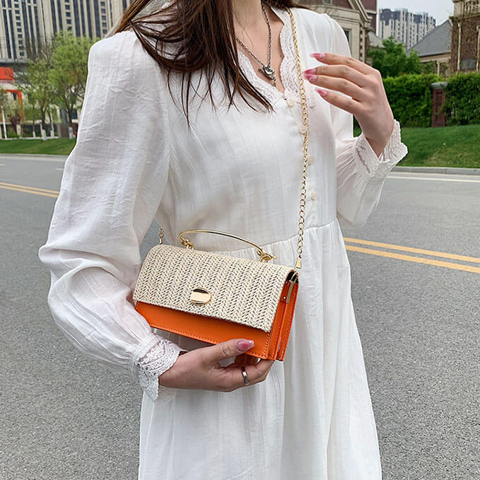 ラフィア風素材のフラップがデザインされたハンドバッグ。